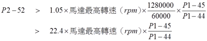 例如伺服馬達轉一圈半,末端機構才會完成一個工作位置,若伺服馬達轉一圈為100,000PUU,則150,000PUU末端機構才會完成一個工作位置。因此P2-52必須設定為150000。 |